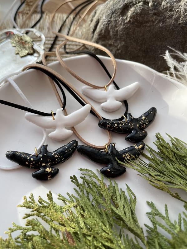 🤍Подвеска «Горлица»🕊 Черная с золотой крошкой. Подвеска: 235грн. _______________________ Материал подвески: полимерная глина - прочная, водостойкая. Замшевий шнур: 1м.20см. Размер птицы: длина размах крыльев - 5см. Вся высота 3см. Товщина: 3мм. ●Стоимость дополнительного шнура: 30грн. ●Доступные цвета: белый, черный, красный, беж, белый. _______________________ 👌Примечание* Срок качества напрямую зависит от условий ношения и хранения украшений. Поэтому, пожалуйста, избегайте контакта с водой, жирными поверхностями, парфюмами и лаком для волос. Снимайте перед сном. ________________________________ 💟Подарочная фирменная упаковка. ✉️Наложен платеж по предоплате 200грн 📮Открытка Новой почтой, Укр-почтой #Соломия #Серожки #18к #золото #квадрат #чокер #украса #перлины #кришталь #solomiya #бижутерия #круглые_сердежки #птичка #голубка #голубка #голуба #птица #голушка #горлица #подвеска #шнур
