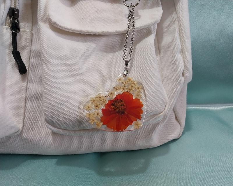 Брелок (обвес на сумку) Сердце 5,5х5 см с настоящими цветами в прозрачной эпоксидной смоле : белые цветы бузины и оранжевая космея. Фурнитура : цепочка из нержавеющей стали (13 см) и застежка карабин.