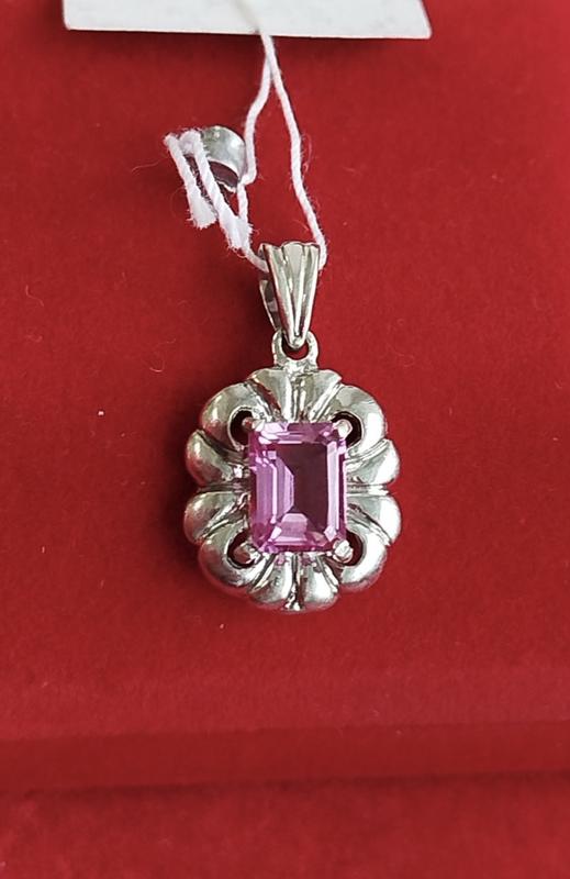 Серебряный кулон 925 пробы с вставкой розового корунда, вес изделия 2,35 грамма.