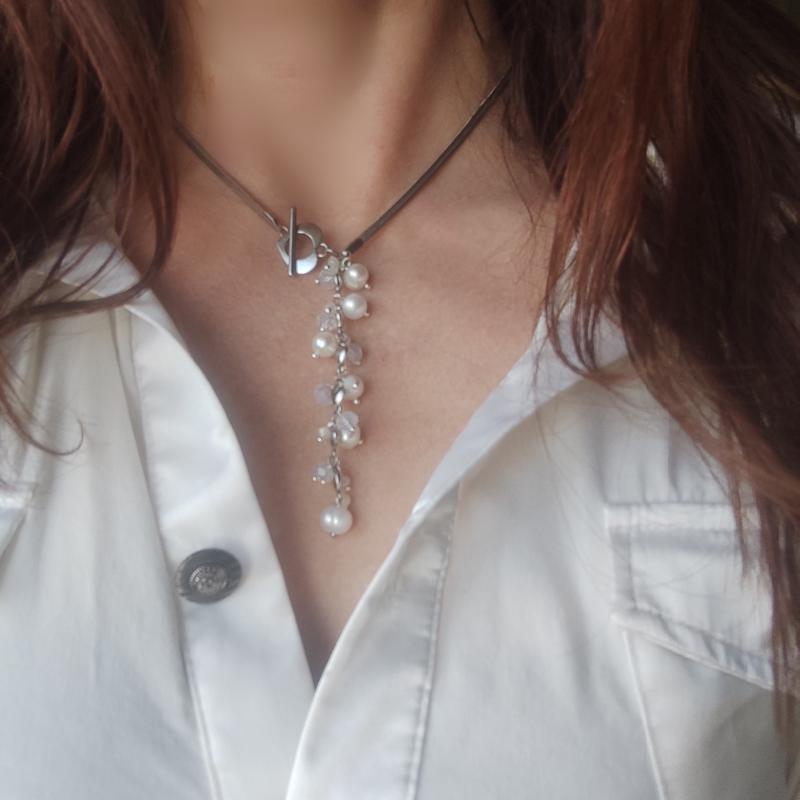 Вся фурнитура и цепочка из нержавеющей стали, которая имеет красивый блеск, не темнеет и не вызывает аллергических реакций, не боится воды. Длина цепочки - 40 см. Длина подвески с перлами и стеклянными бусинками - 8 см.