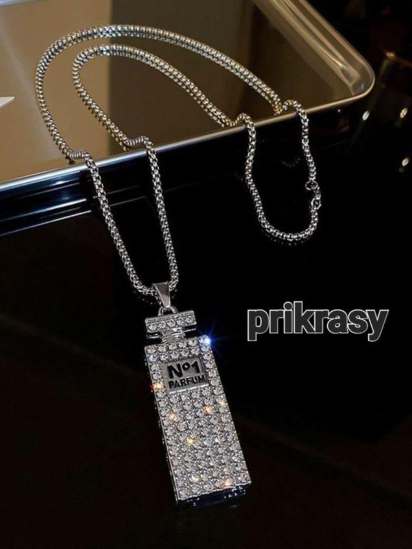 крутая подвеска бутилочка парфюма. длина цепочки-70см подвеска-6,5см/2см кулон.усаденный камушками. металл цинковый сплав. (ном-038К)