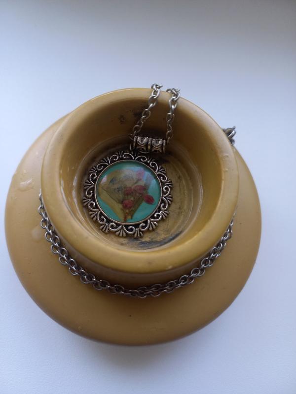 Подвеска на цепочке, содержит натуральные цветки, сохраненные в смоляном покрытии. Длина цепочки - 24 см, диаметр подвески - 2,7 см.