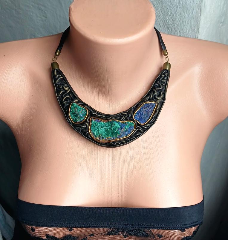 натуральная кожа, азурит, азурмалахит размер 10х14 см длина 42+ см