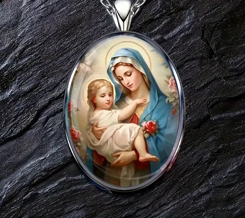 Элегантное ожерелье Девы Марии - Религиозные украшения с овальным стеклянным кулоном.Прочная цепочка для повседневного ношения, вечный дизайн, изящное мастерство