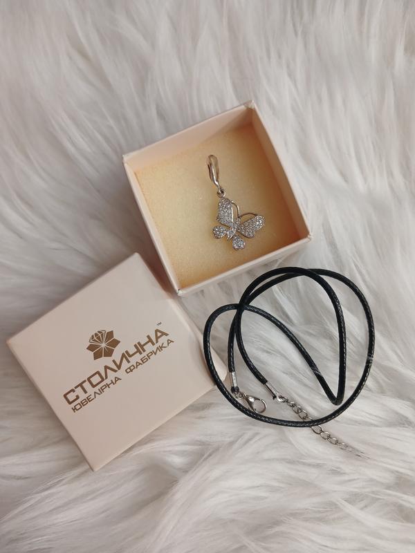 Серебряная подвеска в виде бабочки с маленькими фианитами. Замеры: длина 1,5 см (длина с ушком 3 см), ширина 1,8 см. Оделала только раза два. Этикетки отсутствуют. Черный шнурочек простой, не серебряный.