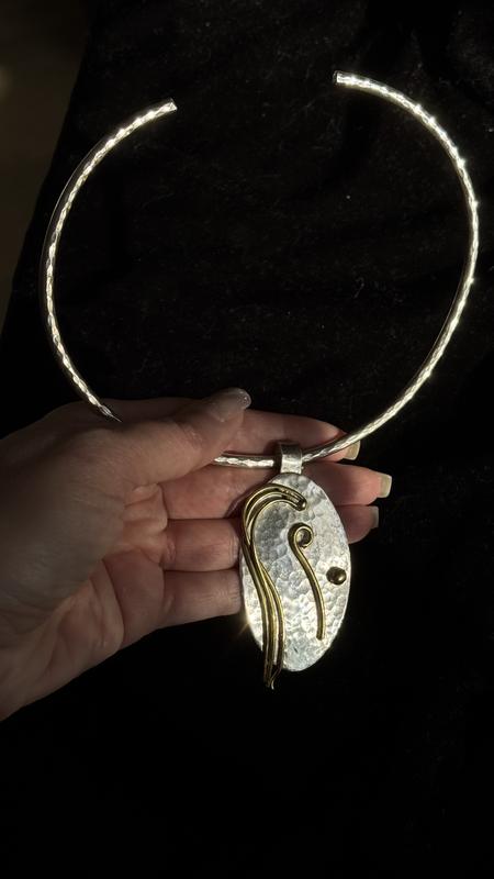 Масивний металевий кулон з масивною підвіскою ручної роботи. Сріблястий з елементами позолоти, в етно стилі. На кулоні є потртості невеликі спереду і з заду помітні приблизькому розгляданні