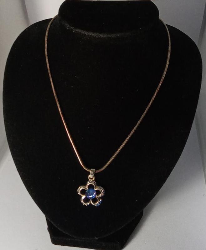 Подвес- цветок на цепочке. Украшения выполнены из ювелирного сплава серебряного цвета, вставки голубые кристаллы. Длина цепочки 45 см, удлинительная цепочка 6 см.