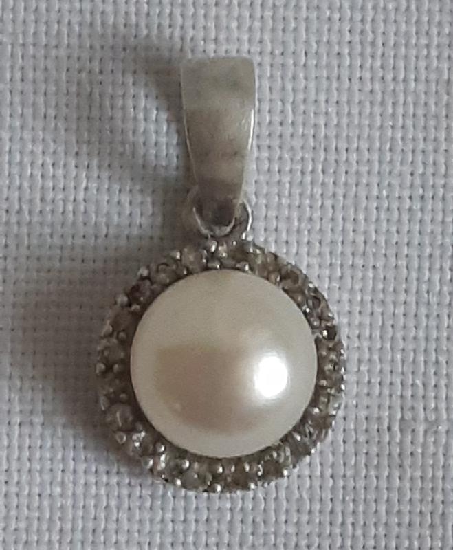 Серебряная подвеска с жемчугом и фианитами. Материал серебро 925 пробы. Натуральный жемчуг. Размер подвески 18х10 мм. Вес 1,84 грамм.