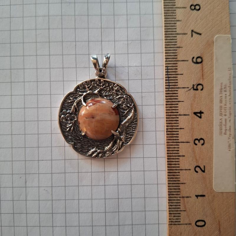 Металл: серебро 925 Вес: 9.5 г Покрытие: Оксидирование Вставка: естественная яшма Габаритные размеры подвеса: высота – 40 мм; ширина – 31 мм; ширина ушки (внутренняя) – 4.5 мм. Клеймо нанесене лазером.