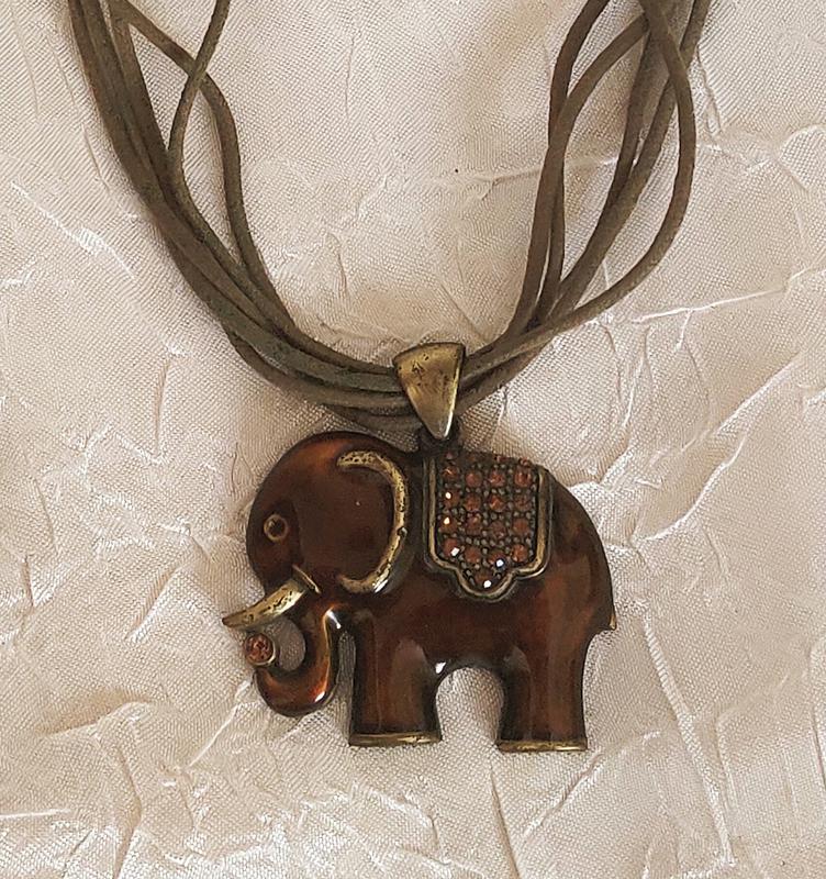 Милая подвеска со слоником , чуть ниже до яремной выемки. Слоние покрыт блестящей коричневой эмалью и украшен стразами, на лентах тесьмы. Пишите, спрашивайте, отвечу на все вопросы. Для элегантного стиля. Отправка после оплаты на карту нп, мист, укрпочтой.