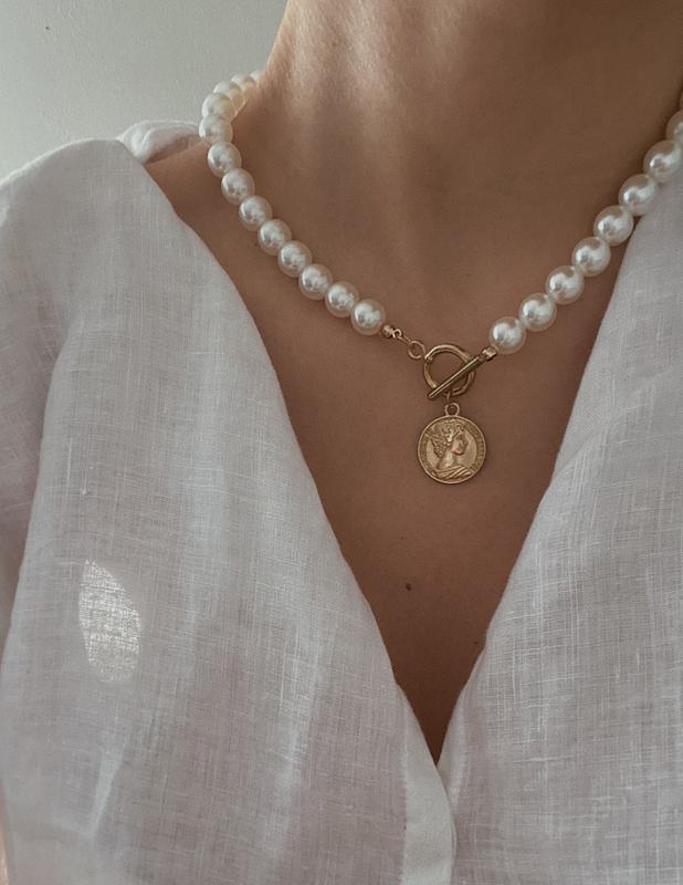 Підвіска з білими перлинками та цікавим золотим кулоном