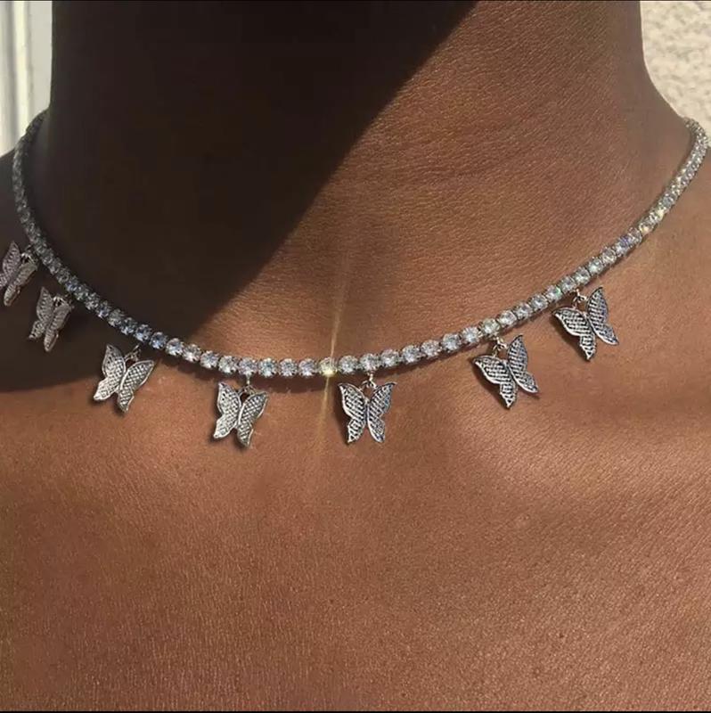 женская серебристая цепочка с стразами и бабочками