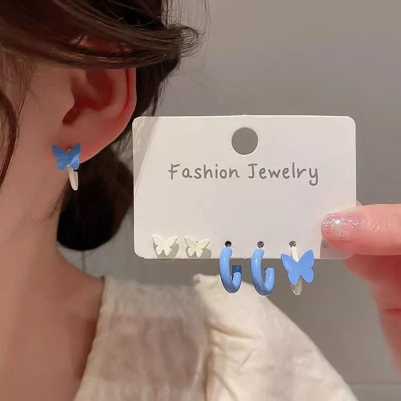 Набір сережок з трьох пар. Тип металу: цинковий сплав. Колір: білий/голубий. Код 1961.