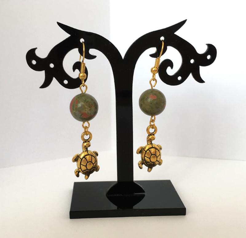 Серьги с бусиной унакит и подвеской черепашка