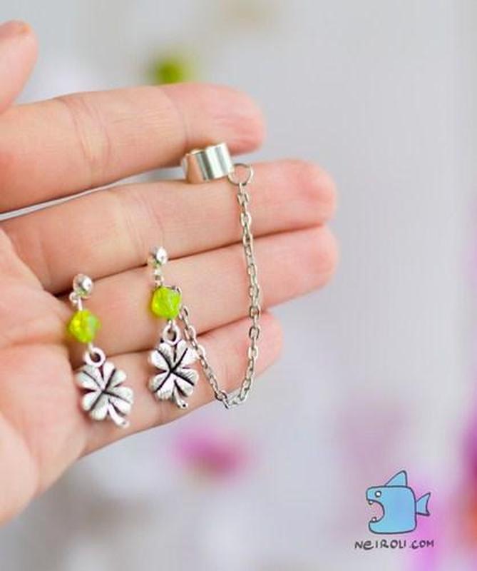 Кафф "Лист четырехлистного клевера". Пара. Ручная работа Материал - сплав металлов, бижутерия. Цвет - серебро. Требует прокола в мочке. Цена за 1 пару. На одно ушко - серьга - кафф, на второе пусетта. Фото вживую. Фотографии защищены авторским правом КАФФ РУЧНОЙ РАБОТЫ!!!! В наличии только у нас!!!!! Будьте неотразимы в эксклюзивных украшениях!!! Невероятно красивые и стильные украшения, которые вы наверняка встречали на фотографиях знаменитостей, серьги каффы теперь можно купить и в Украине. Ни одна модница не сможет обойти вниманием новый вид серег – это каффы. Что же это за серьги? Они имеют самые невероятные, самые причудливые формы, но главное, вы можете купить кафы в Украине в интернет магазине *******************