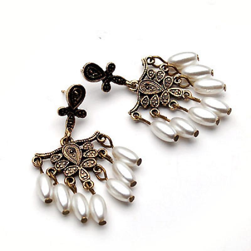 Серьги-гвоздики из желтого состаренного металла с эмалью и бусинами Примерный размер: 4 х 5,5 см