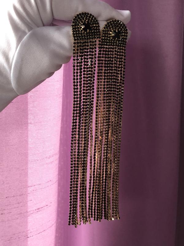 Серьги длинные нарядные с чёрными кристаллами. Все кристаллы закреплены в лапках. Максимальная длина серьги 17 см . 🔥