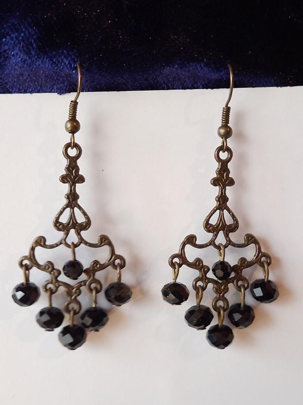 Серьги, ручная работа, основа цвета бронзы, хрустальные бусины черного цвета.