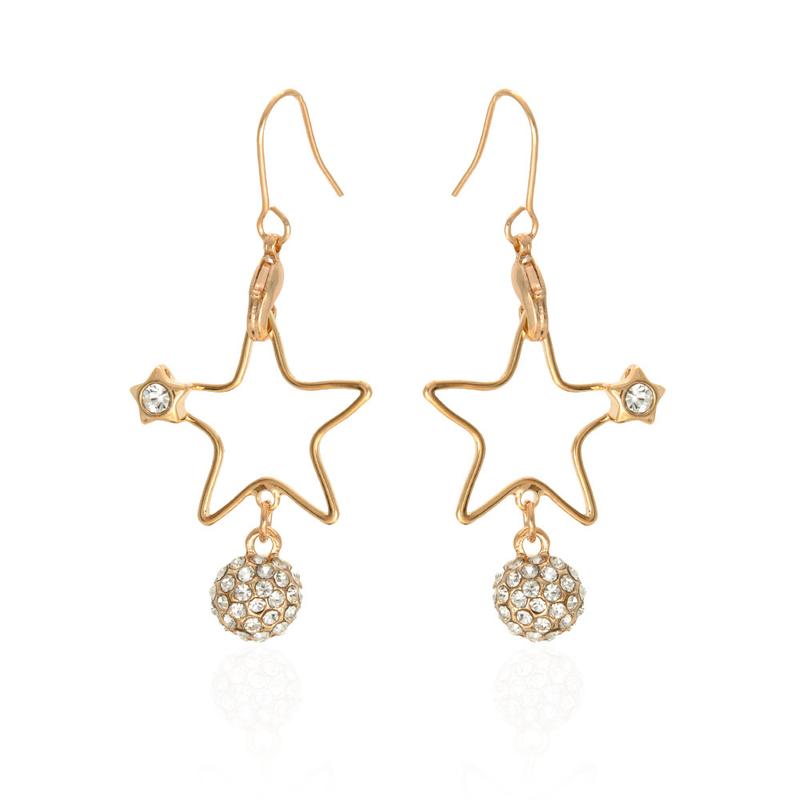 Серьги 967002 Стильные и оригинальные серьги-подвески выполнены в форме красивых звездочек. Они подойдут ко множеству нарядов в таких стилях: повседневном, романтическом, классическом и вечернем. Украшение подчеркнет индивидуальность и прекрасный внешний вид своей обладательницы. Оно сочетается с деловыми костюмами, простыми джинсами, вечерними пышными платьями и легкими шифоновыми блузами. Аксессуар понравится и пригодится каждой девушке, независимо от ее возраста и предметов гардероба. Дизайн данной модели лаконичный, но при этом необычный. В нижней части она дополнена металлическим шариком, покрытым россыпью белых стразов. Яркий блеск декоративных камней привлечет внимание всех окружающих. В ассортименте представлено два варианта расцветок для более широкого выбора: золотистая и серебристая. Качественная застежка-петля надежно фиксирует и удерживает сережки в нужном положении на протяжении всего дня. Товар изготовлен из прочного и высококачественного металла со специальным покрытием. Материал отличается долгим сроком службы и устойчивостью к разным повреждениям. Серьги довольно легкие, не оттягивают и не травмируют мочку ушка, а также не повреждают место прокола. Изделием практически невозможно травмироваться. Украшение не сковывает и не ограничивает движения, не цепляется за одежду. Носить его можно много часов, при этом не ощущая никакого дискомфорта.