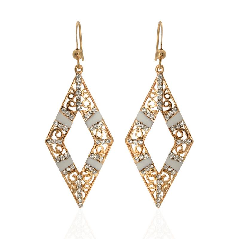 Серьги 891003 Массивные стильные серьги в форме ромбиков дополнят множество нарядов в различных стилях: вечернем, классическом, романтическом и повседневном. Они подчеркивают индивидуальность, красивый внешний вид и хороший вкус своей обладательницы, а также добавляют ей особого шарма. У любительниц оригинальных образов и современной одежды такой аксессуар обязательно должен быть всегда под рукой. Металлическое ажурное изделие дополнено белыми стразами, волшебно переливающимися на свету. Сережки изготовлены из прочного и высококачественного материала золотистого или серебристого оттенка на выбор. Он отличается долгим сроком службы и устойчивостью к повреждениям. Надежная застежка-петля не травмирует и не растягивает место прокола и мочку уха. Такой фиксатор минимизирует риск потери атрибута, делает его снятие и фиксацию очень быстрыми. В ассортименте представлено несколько модных расцветок данной модели, благодаря чему любая девушка сможет подобрать наиболее подходящий ей вариант. При контакте с водой продукт не окисляется и не темнеет. Он сохраняет свой невероятный блеск и не тускнеет на протяжении многих лет. Товар можно приобрести в качестве оригинального и нужного подарка.