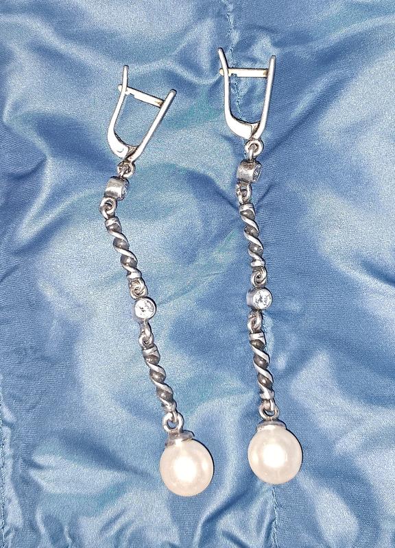 очень красивые сережки редкая модель два камушка и жемчуг серебро ,есть проба состояние новое,не одевались длинна полностью 7,5 см сама цепочка 6,5 см редкая модель хорошее качество торга нет