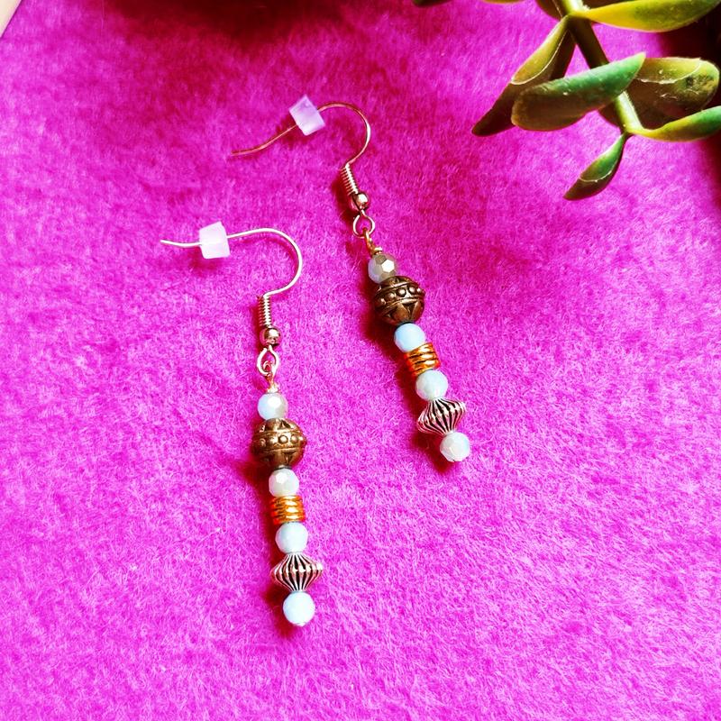 Серги-висюльки. Возраст - нулевые, современные годы. Стиль - этнический. На длинном штифте собраны голубовато-серые граненые бусины из стекла. Он чередуются с бусинами из металла. Украшение без маркировки, в отличном состоянии. Длина - 5,5 см. Серебристая фурнитура. К объявлению прикреплен видеообзор.