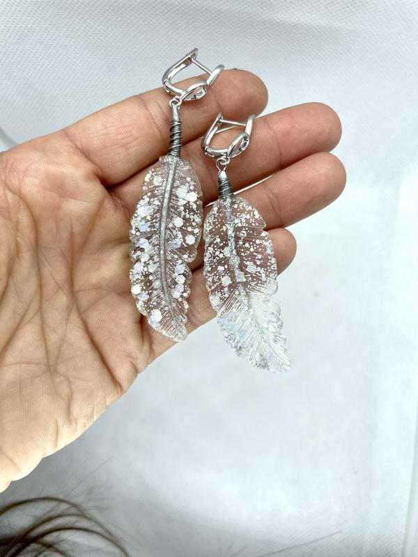 Серьги перья полупрозрачные Фурнитура медсплав Изготовлены из эпоксидной смолы Оплата на карту или при получении Отправка Новая почта или Укрпочта Упаковка коробка.