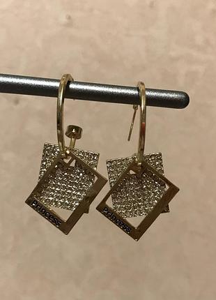 Серьги Princess В цвете золото с серебристыми камешками. Без деффектов. Металл хороший, не хлипкий, не тонкий. Хорошее качество. Средние по весу. Высота квадратика серебристого - 2 см Ширина - 1,6 см