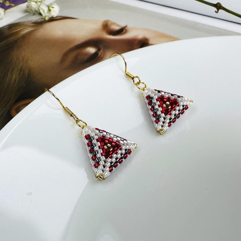 Треугольные серьги из японского бисера Miyuki Delica. Элегантное украшение, которым можно дополнить как праздничный, так и повседневный образ. Размер: 3,5*2 см. Материал: японский бисер, фурнитура из нержавеющей стали Серьги имеют подарочную упаковку.