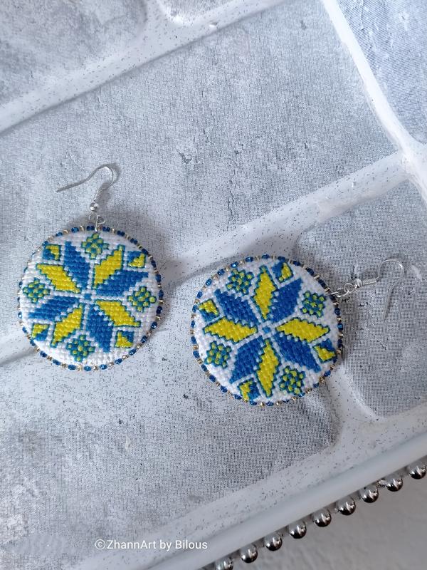 Ручная работа. Серьги изготовлены из канвы с ручной вышивкой нитями мулине. Обратная сторона обшита натуральной кожей. Серьги прочные, не гнутся. Толщина серьги – 2 мм. Диаметр - 4.5 см Длина серьг - 6.5 см. Возможен повтор в любом другом цвете и нужном размере.