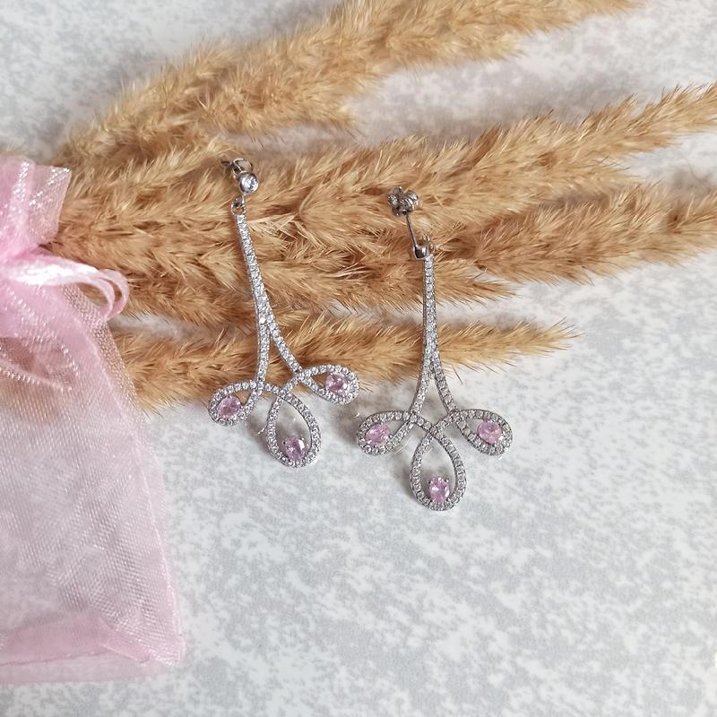 Шикарные серьги, упакованные в подарочный мешочек. Тип крепежа гвоздик, металлическая застежка. Серьги изготовлены из меда сплава с покрытием серебристого цвета. Украшенные множеством камней, они очень красиво сверкают и украшают образ. Длина серьг 4,8 см.