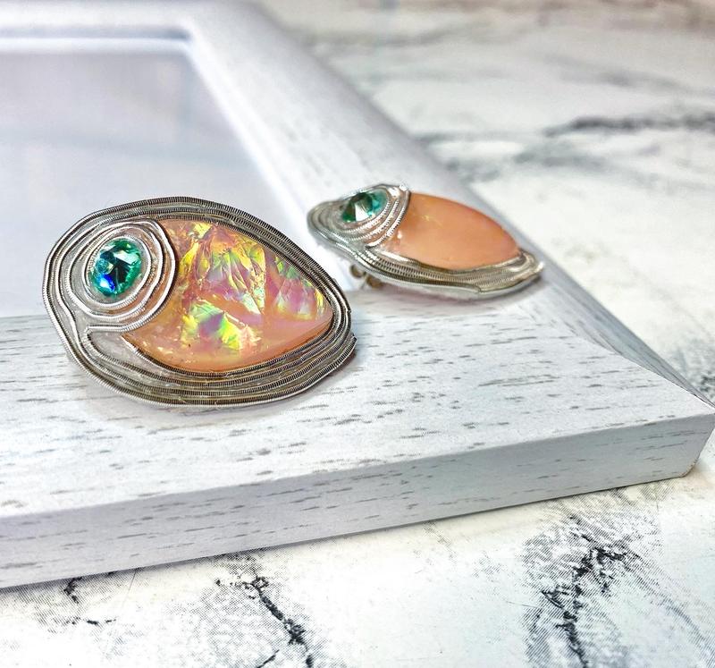 Серьги из искусственного опала, зеленого кристалла и серебристой кантители Стильное и эксклюзивное дополнение к современному образу