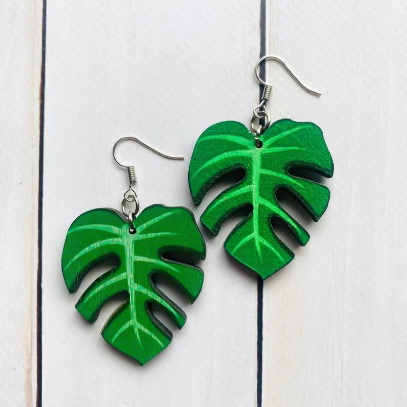 Серьги деревянные. листочек (принт 7.1)