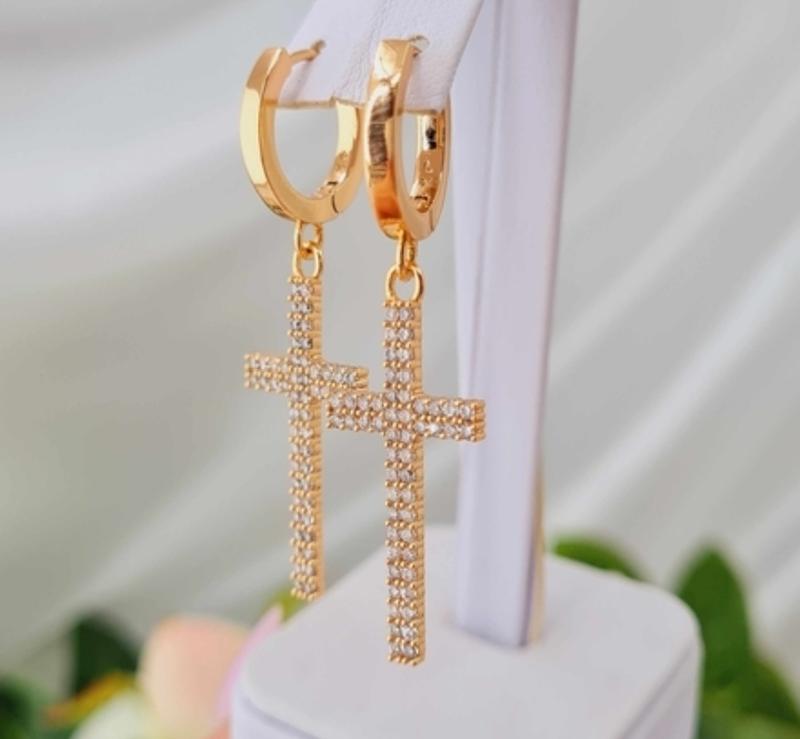 Серьги кольца 1,3см, с подвеской Крестиками в камешках 4см, Xuping 18K Код товара 115706