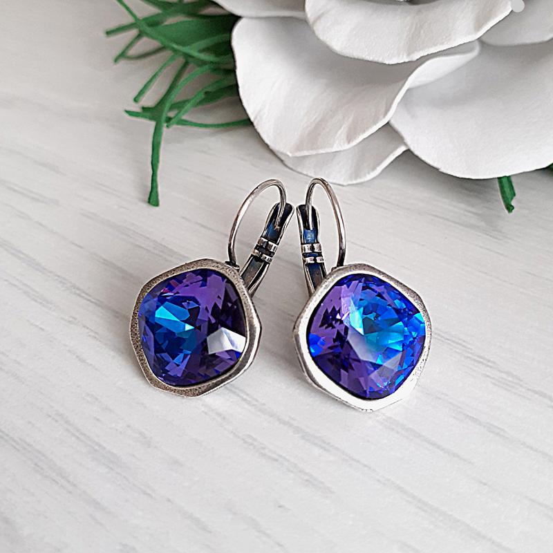 Можно сделать с кристаллами другого цвета. Серьги ручной работы с оригинальными кристаллами Сваровски в ювелирной огранке. Цвет кристаллов – Heliotrope – фиолетово-синие тона с голубыми бликами внутри кристалла. На фото пыталась максимально передать цвет. Размер кристаллов 12×12 мм Длина серьги примерно 25 мм. Фурнитура на серьгах производства Германии (ручная работа) высокого качества из латуни, покрытой гипоаллергенным покрытием "античное серебро", метод покрытия - гальванопластика. Застежка на серьгах – французская. Серьги подойдут для повседневной носки.