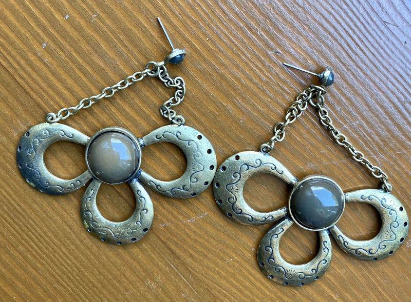 Серьги винтаж, большие, не лёгкие, красиво смотрятся. Под золото, большой камень серый, если вглубь присмотреться, то золотой. А маленький камень темно серый.