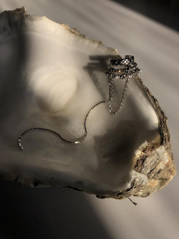 Яскравий кафф з перлинами та ланцюжками. Може бути як самостійним аксесуаром, так і поєднуватись з сережками.