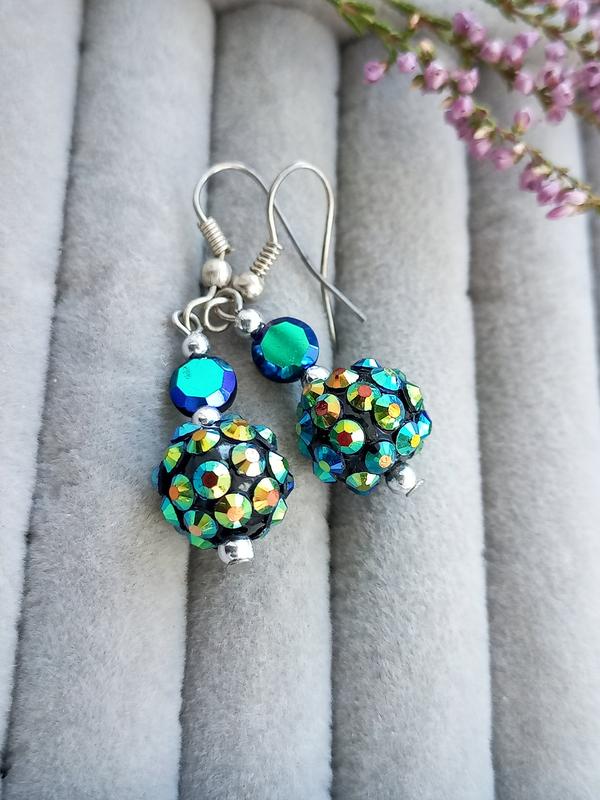 Милые винтажные серьги, напоминающие дискотечный шар. Верхняя бусина стекло, шарик пластиковый и кристаллы на нем тоже пластик с покрытием aurora borealis. В хорошем состоянии. Длина 4,3 см.