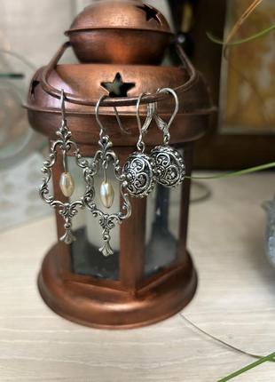 1. Металлические серьги-подвески серебряного цвета в готическом стиле. С искусственными жемчугом. Очень легкие. Без покрытия. 2. Насистины ажурные, фурнитура металлическая цвета античного серебра Цена за 1 пару