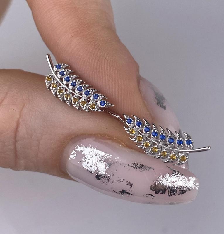 Серебряные серьги каффы листочек с желтыми и голубыми камнями
