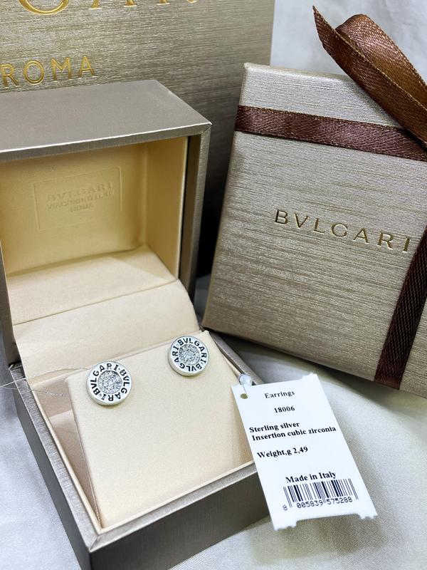 Срібні сережки сережки пусети гвоздики круглі з логотипом булгарі bvlgari з каменями камін...