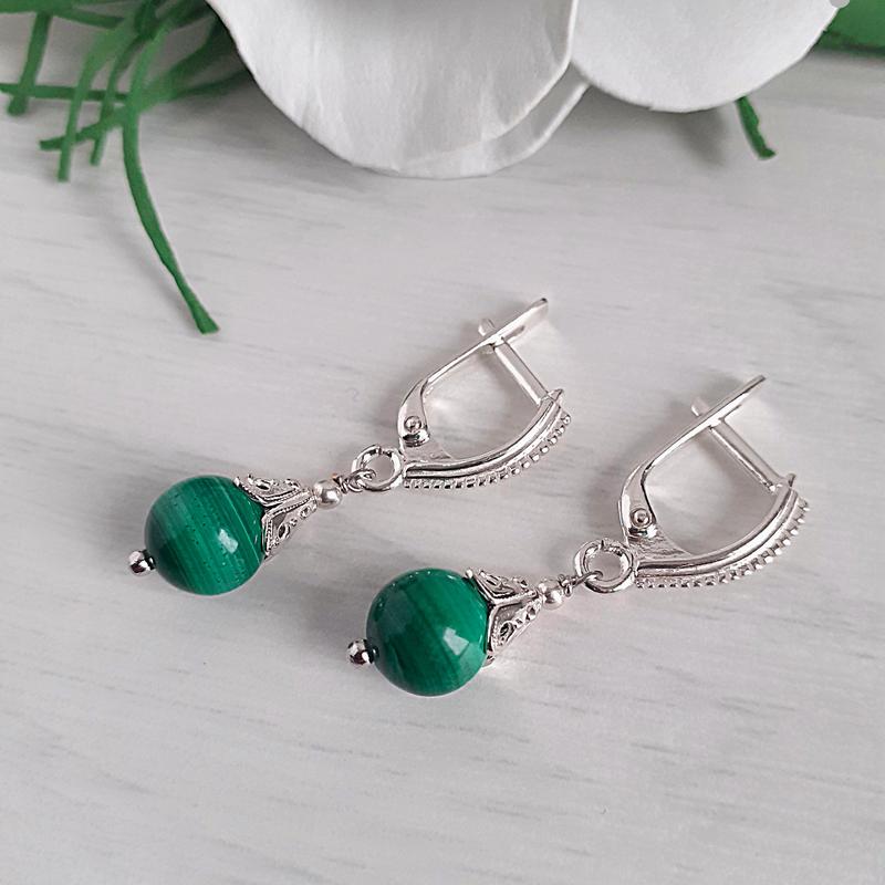 Серьги ручной работы с натуральным малахитом. Все бусины различной расцветки, рисунок также разный. Цвет - спокойный зеленый оттенок. Насыщенность цвета малахита - средняя. Размер бусин 8 мм Длина серьги около 26 мм Фурнитура производства Украины из серебра. Качество отличное! Замочки на серьгах удобные и надежные (английская застежка). Серьги небольшие и не тяжелые, подойдут для повседневной носки.