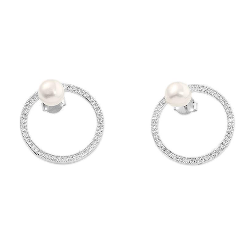 Серебряные серьги пусеты геометрия с жемчугами и фианитами