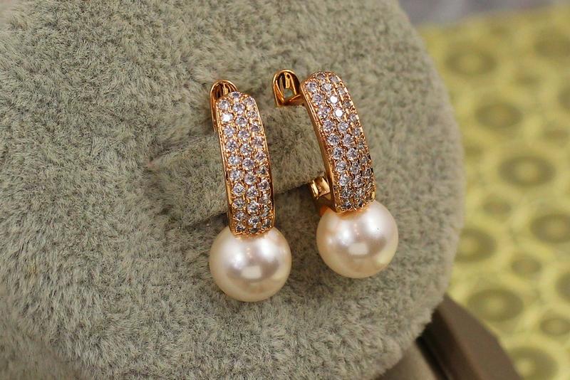 Серьги Xuping Jewelry три дорожки с жемчугом золотистые длина 2 см ширина 7 мм жемчужина 7 мм застежка английская