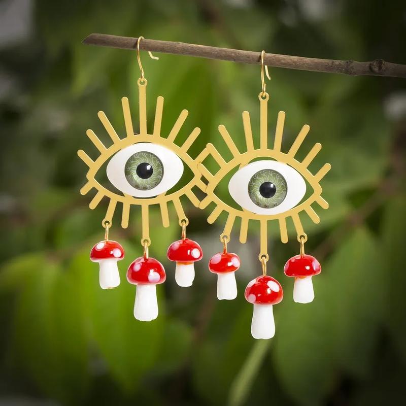 Крутяцькі оригінальні сережки "Око з мухоморами" Довжина зі швензою 7 см, ширина 4 см