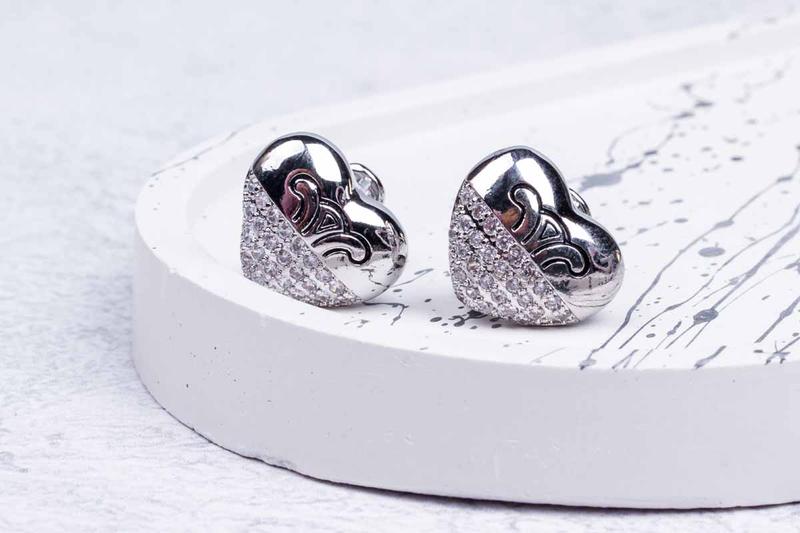 Ніжні сережки у формі сердечко, половинка інкрустована синтетичним цирконієм, є лого Медична нержавіюча сталь, покриття родій Ця біжутерія люкс якості, не темніє, не викликає алергійних реакції, не фарбує шкіру, пусет срібло 925 Загальна висота 1,5 см, ширина 1,7 см Якщо потрібно зробимо додаткові фото Товар новий, в наявності Відправка на протязі 24 годин