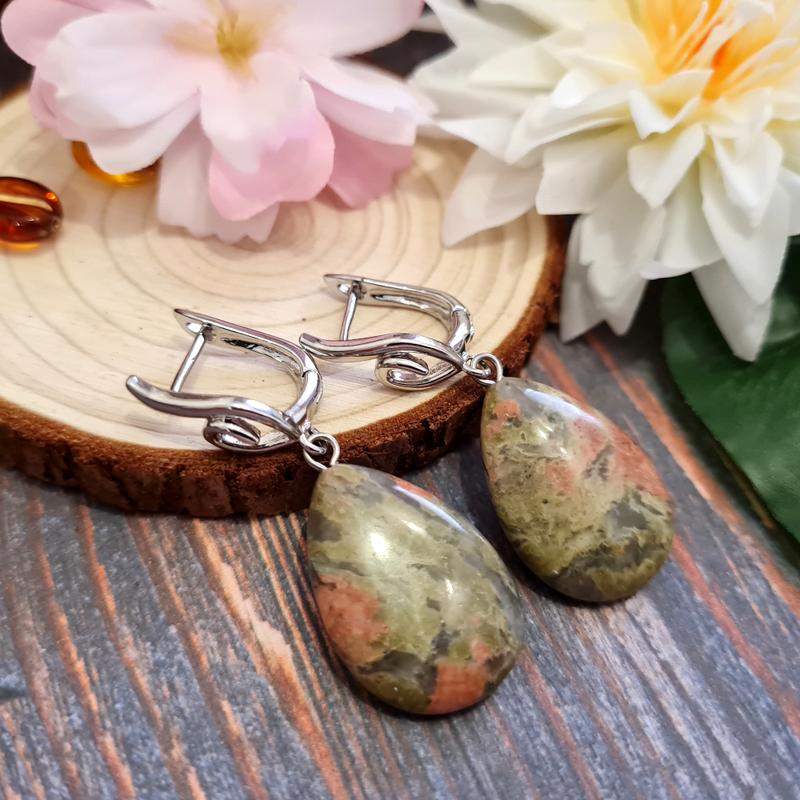 🍃🌟Романтические серьги с подвесками в форме капель из натурального камня яшма унакит. Красивые швензы – английский замок из гипоаллергенного сплава. Фурнитура серебристого цвета. 🍃 Размер: швенза 1,8 см, размер подвески 2,5 см. Состав: натуральный камень яшма унакит, ювелирный сплав
