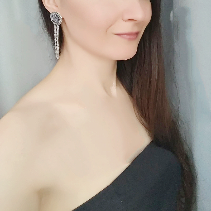 Ручная работа. Вечерние серьги изготовлены из стразовой цепочки примерно 2 мм и черно-серебристого кабошона. Блеск очень красивый. Длина серьги - 7,5 см. Швензы-гвоздики (серебристые) с силиконовыми заглушками, по желанию можно изготовить в виде клипс. С обратной стороны серьги обшиты эко-кожей. По желанию праздничные серьги могут быть изменены (цвет и длина).