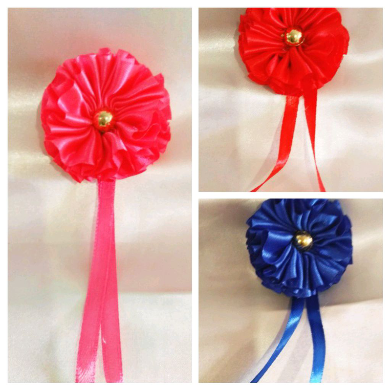 Тип прикраси: Інші прикраси Матеріал: Інший матеріал Матеріал: Інший матеріал Кілька примірників у наявності Елемент прикрашання "Квітка" виготовлений з атласної стрічки. Крепеж - заколка. Розмір — діаметр 5 см. Ціна за 1 метр.