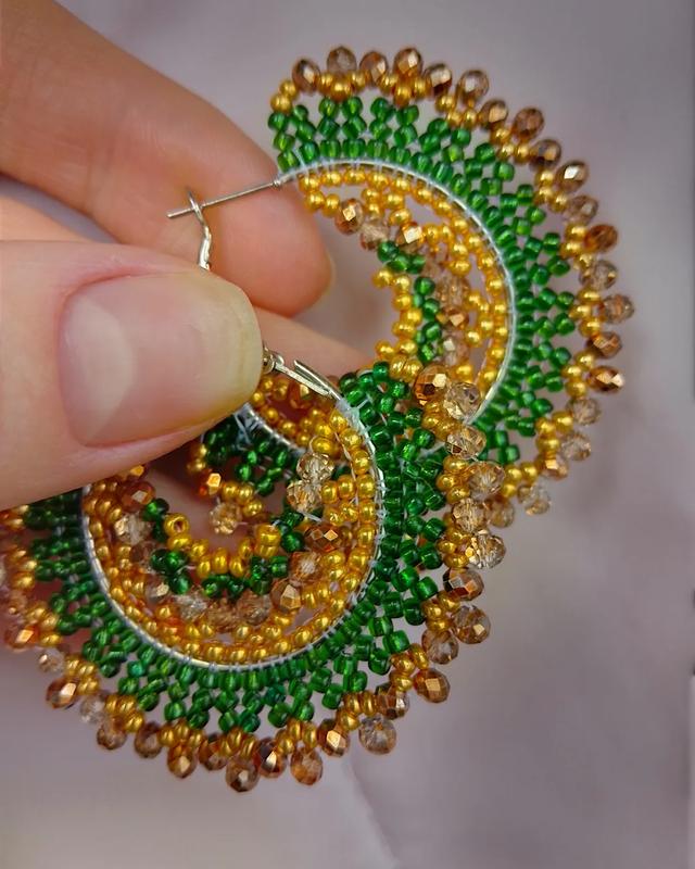 Эти изумрудные серьги изготовлены из мелкого бисера и золотистых бусин, что создает волшебную симфонию цветов и блеска. Каждый элемент внимательно выбран и выполнен с большим мастерством, придавая им элегантный вид. Они добавляют неповторимый шарм вашему образу, будь то на вечеринку, свадьбу или ежедневной прогулке.
